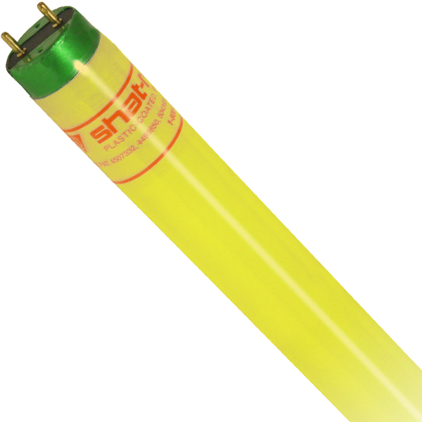 Shat-R-Shield safety-coated, shatterproof Gold Lamps produce high-lumen task lighting and they filter-out ultraviolet (UV) emissions and wave lengths below 520 nanometers. Safely eliminating these wave lengths is crucial in light-sensitive environments such as semiconductor manufacturing and research laboratories. Unlike plastic sleeves, the skin-tight safety coating prevents heat build-up that leads to premature lamp burnout, discoloration and cracking. Shat-R-Shield shatterproof T8 fluorescent lamps are coated from end-to-end with the patented, plastic safety coating. The coating reduces light output by less than 1%. Antioxidants and ultraviolet stabilizers are present in most coatings to block UV emissions. If used properly under warranty criteria, the coating is guaranteed not to yellow, crack or flake for the rated-life of the lamp. If a Shat-R-Shield fluorescent lamp is accidentally broken, virtually all glass, phosphors and mercury are safely contained within the clear and tough, skin-tight plastic coating.